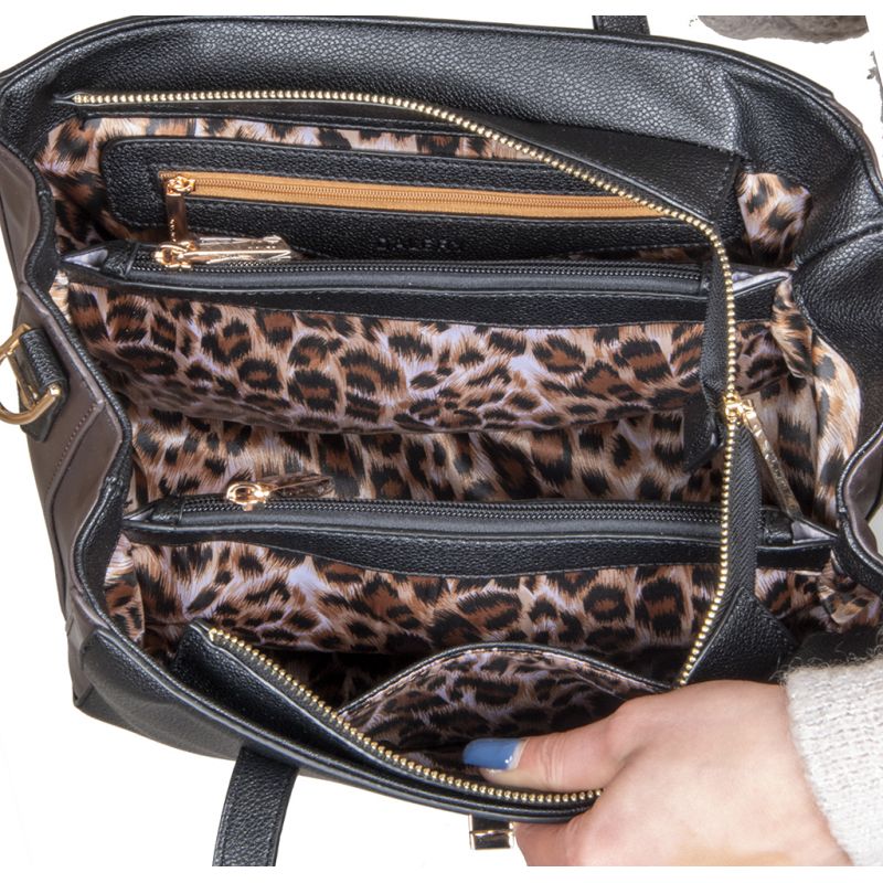 A l’intérieur, le sac est composé de 3 compartiments avec deux poches zippées centrale, et une poche zippée sur le cote ! A vous les jolies organisations de sac !